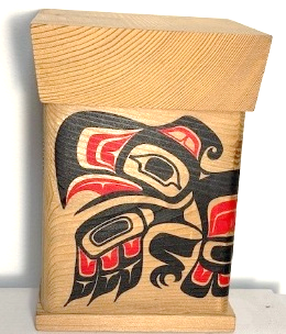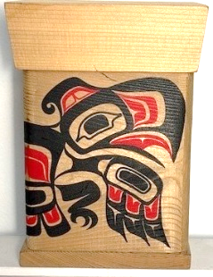 Finely finished wood box with  indigenous art on each side (4” x 4” + 6.5” high)